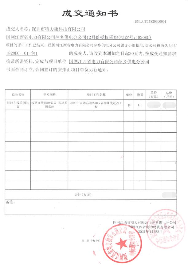 國網(wǎng)江西省電力有限公司萍鄉(xiāng)供電分公司12月份授權(quán)采購(批次號: 1820EC)項目的評審工作已結(jié)束。經(jīng)國網(wǎng)江西省電力有限公司萍鄉(xiāng)供電分公間領(lǐng)導(dǎo)小組批準(zhǔn),我司(深圳市特力康科技有限公司)被確認(rèn)為包1820EC- 101-包1(線路在線監(jiān)測裝置,覆冰監(jiān)測系統(tǒng))的成交人,成交通知如下: