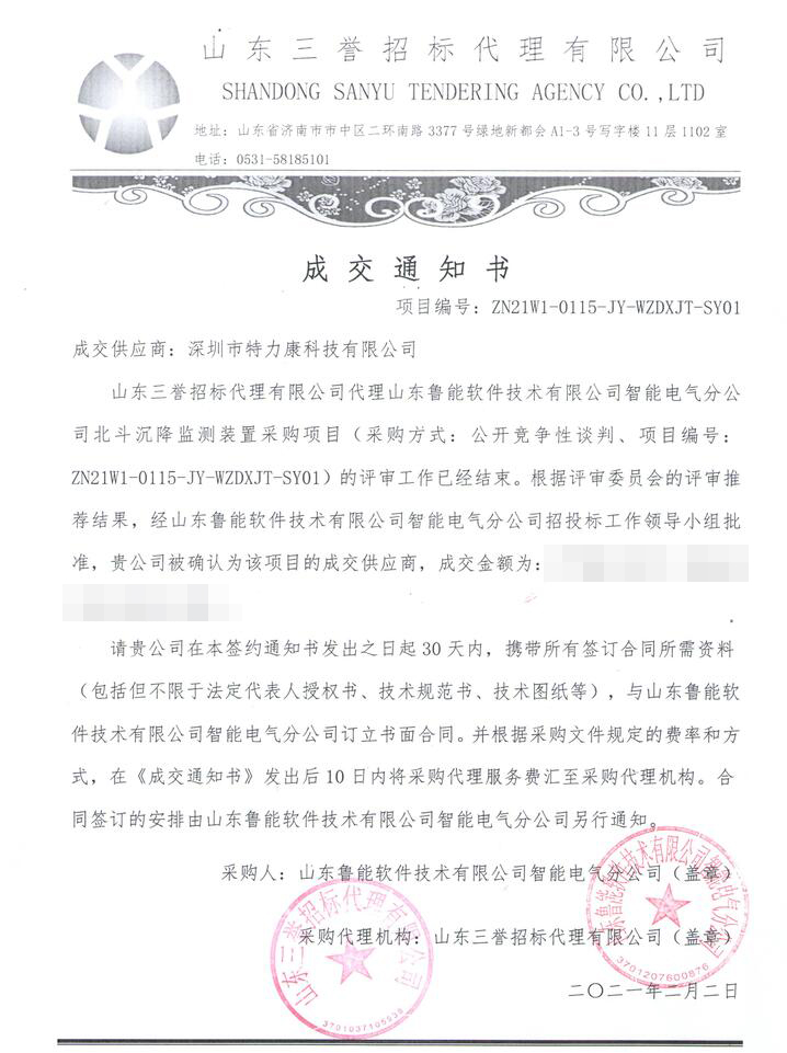 本次山東三譽(yù)招標(biāo)代理有限公司代理山東魯能軟件技術(shù)有限公司智能電氣分公司北斗沉降監(jiān)測(cè)裝置采購(gòu)項(xiàng)目(采購(gòu)方式:公開競(jìng)爭(zhēng)性談判、項(xiàng)目編號(hào):ZN21W1-0115-JY-WZDXJT-SY01)的評(píng)審工作已經(jīng)結(jié)束。根據(jù)評(píng)審委員會(huì)的評(píng)審?fù)扑]結(jié)果,經(jīng)山東魯能軟件技術(shù)有限公司智能電氣分公司招投標(biāo)工作領(lǐng)導(dǎo)小組批準(zhǔn),我司(深圳市特力康科技有限公司)被確認(rèn)為該項(xiàng)目的成交供應(yīng)商,成交通知如下: