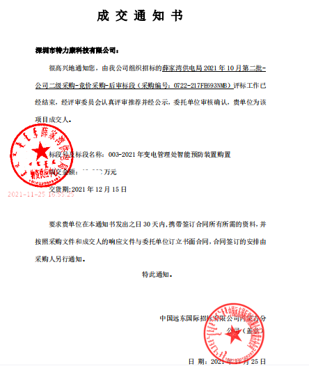 深圳市特力科故有公司:很高興地通知您,由我公司組織招標的薛家灣供電局2021年10月第二批-公司二級采購一競價采購-后審標段(采期編號: 0722-217fe693nnb)評標工作已經結束,經評審委員會認真評審推薦并經公承,委托單位審核確認。貴單位為該項日成交人。標段名稱: 003-2021年變電管理處智能預防裝置購置,成交通知如下: